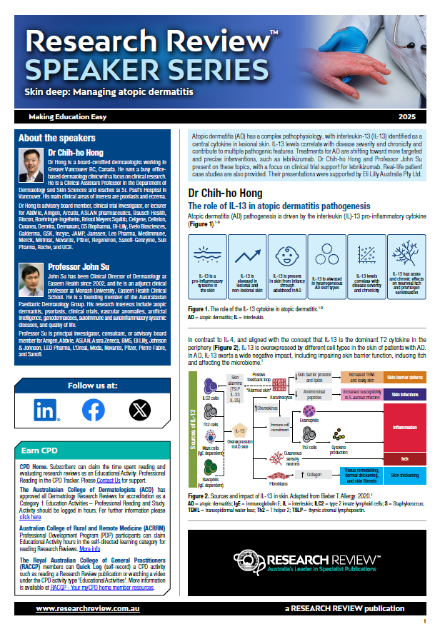 This review summarises treatments for atopic dermatitis which are shifting toward more targeted and precise interventions. Dr Chih-ho Hong and Professor John Su present on these topics, with a focus on clinical trial support for lebrikizumab. Real-life patient case studies are also provided.