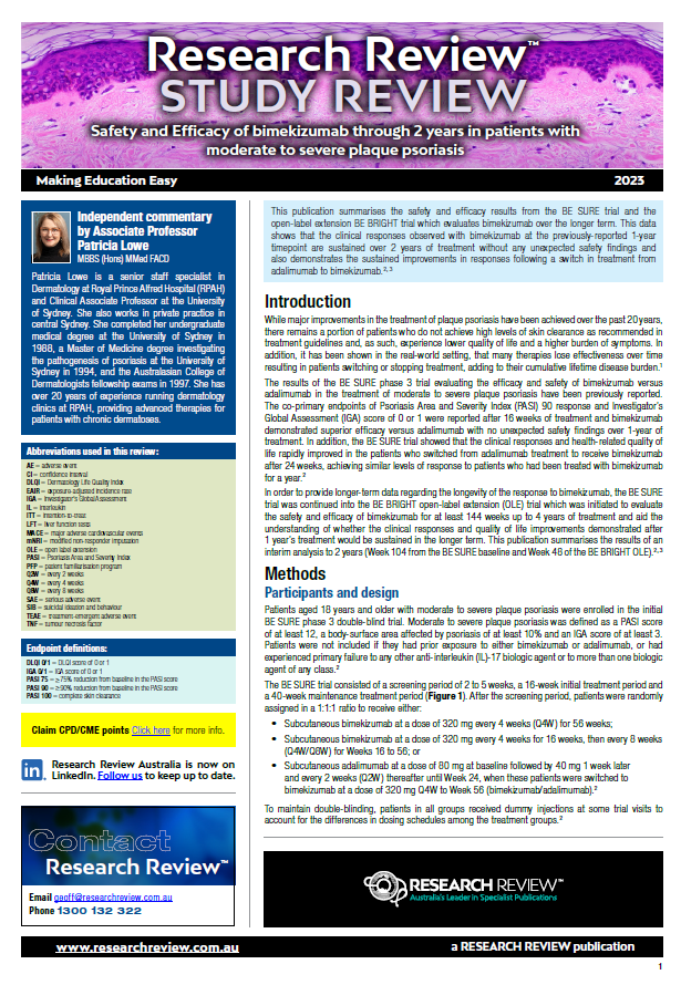 Independent commentary is provided by Associate Professor Patricia Lowe, a senior staff specialist in Dermatology at Royal Prince Alfred Hospital and Clinical Associate Professor at the University of Sydney.