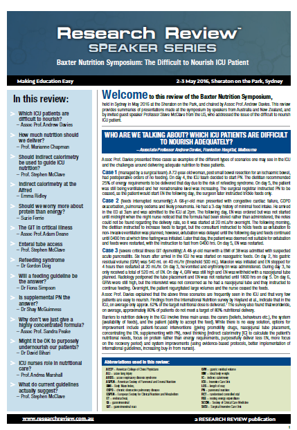 This review is a summary of a sponsored symposium held in Sydney recently and chaired by Assoc Prof. Andrew Davies. It provides summaries of presentations made at the symposium by speakers from Australia and New Zealand, and by invited guest speaker Professor Steve McClave from the US, who addressed the issue of the difficult to nourish ICU patient.