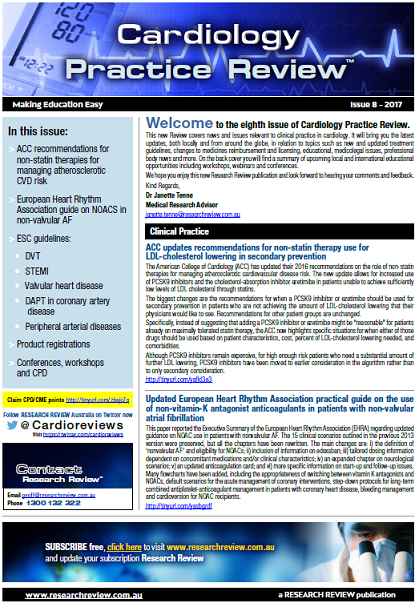 This Review features key medical articles from global cardiology journals with commentary from Assoc Prof John Amerena. The Review covers topics such as myocardial infarction, atrial fibrillation, congestive heart failure, arrhythmia, angioplasty, ischaemic heart disease, cardiac catheterisation, atherosclerosis, deep vein thrombosis and coronary stenting.
