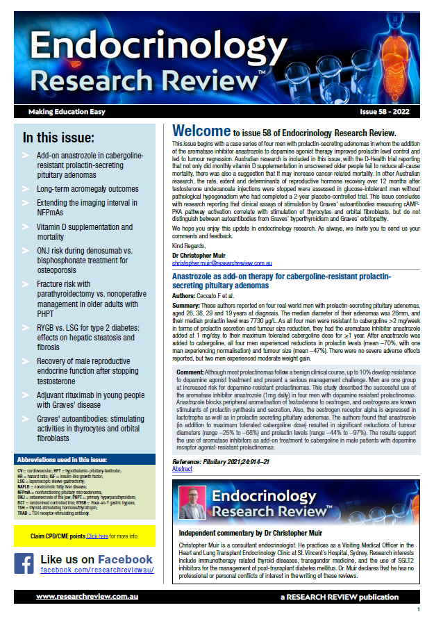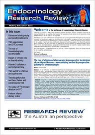 This Review features key medical articles from global endocrinology journals with commentary from Professor Cres Eastman, Professor Duncan Topliss and Clinical Assoc Prof Michael Hooper. The Review covers topics such as diabetes mellitus, hypothyroidism, graves's disease, endocrine disorders, endocrinology guidelines, pituitary gland disorders, sex hormone disorders, adrenal insufficiency, osteoporosis and polycystic ovary syndrome.