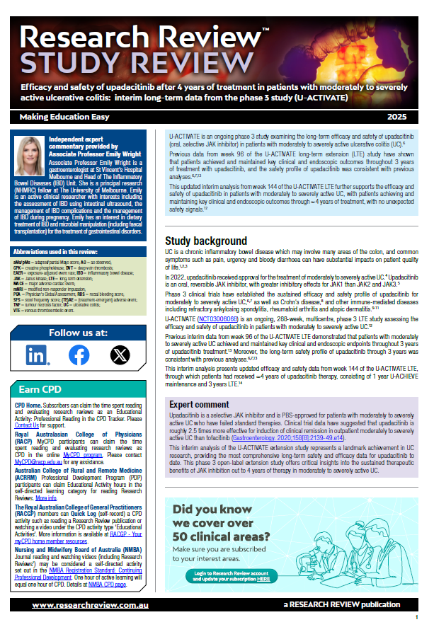 Independent commentary for the review has been provided by Associate Professor Emily Wright, a gastroenterologist at St Vincent’s Hospital Melbourne and Head of The Inflammatory Bowel Diseases (IBD) Unit and a principal research (NHMRC) fellow at The University of Melbourne.