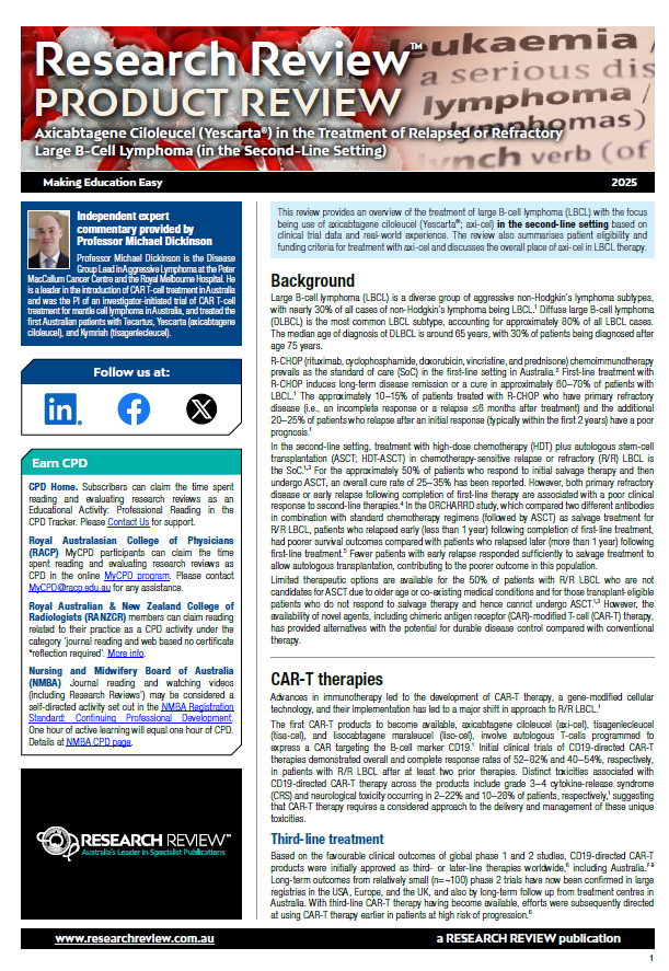 As part of our series focussing on medicines available in Australia, we have added a product review of the use of axicabtagene ciloleucel in the treatment of relapsed or refractory large B-Cell lymphoma (in the second-line setting).