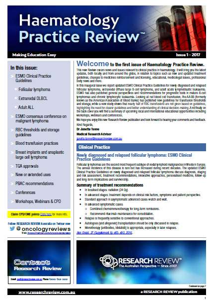 View back issues of Haematology Research Review publications here. Also below are reviews of recent international medical conferences, new medicines, speaker events and other relevant publications.
