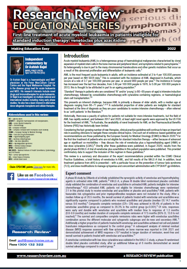 The review includes guiding commentary from Dr Ashish Bajel, a haematologist and BMT physician at the Peter MacCallum Cancer Centre and the Royal Melbourne Hospital.