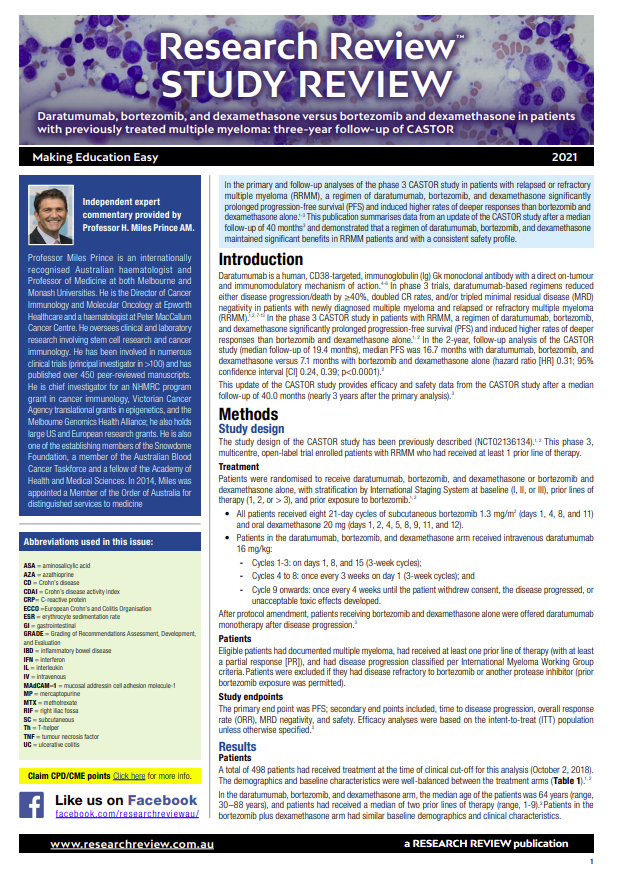 The study involved almost 500 patients with a median follow up of 40 months. Commentary is provided by Professor Miles Prince, Professor of Medicine at both Melbourne and Monash Universities and Director of Cancer Immunology and Molecular Oncology at Epworth Healthcare.