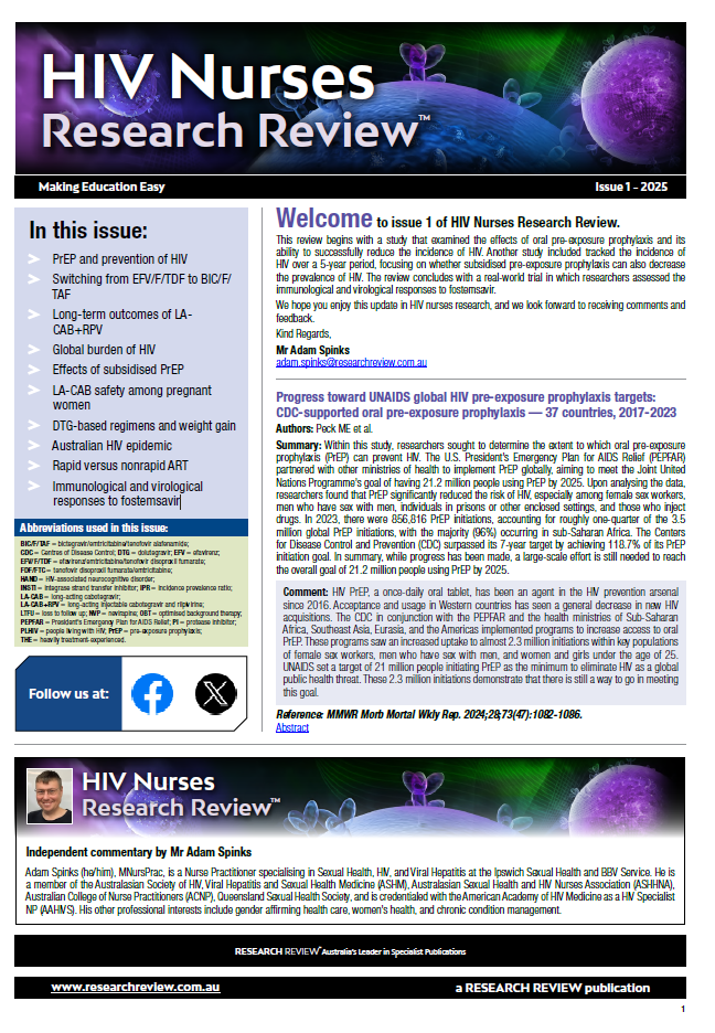 This Review features key medical articles from global infectious disease journals with commentary from Professor Andrew Carr. The Review covers topics such as antiretroviral agents, nucleotide reverse transciptase inhibitors, AIDS, HIV clinical staging, antiviral therapy, protease inhibitors and integrase inhibitors.