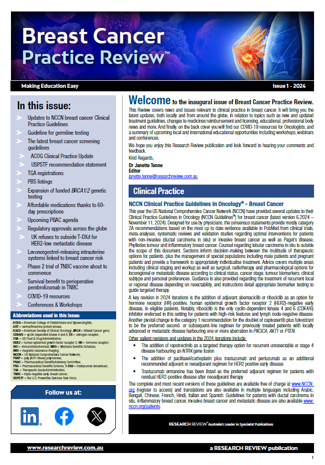 View back issues of Breast Cancer Research Review publications here. Also below are reviews of recent international medical conferences, new medicines, speaker events and other relevant publications.