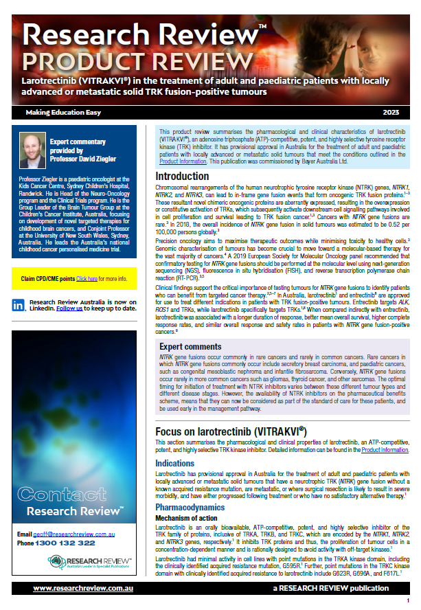 This review discusses pharmacodynamics, indications and dosage, contraindications and a series of clinical studies featuring larotrectinib use. It also provides commentary and recommendations from Professor David Ziegler, a paediatric oncologist at the Kids Cancer Centre, Sydney Children’s Hospital, Randwick.