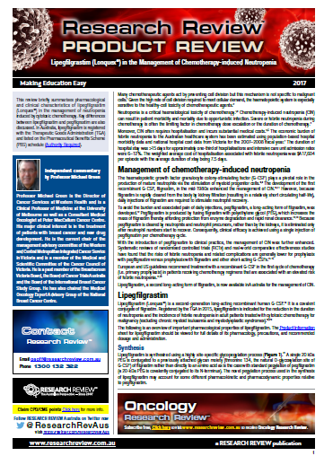 This review focuses on mechanism of action, dosing, precautions and drug interactions, comparison with pegfilgrastim and some key studies. Expert commentary is provided by Professor Michael Green, Director of Cancer Services at Western Health and, Clinical Professor of Medicine at the University of Melbourne as well as a Consultant Medical Oncologist at Peter MacCallum Cancer Centre.