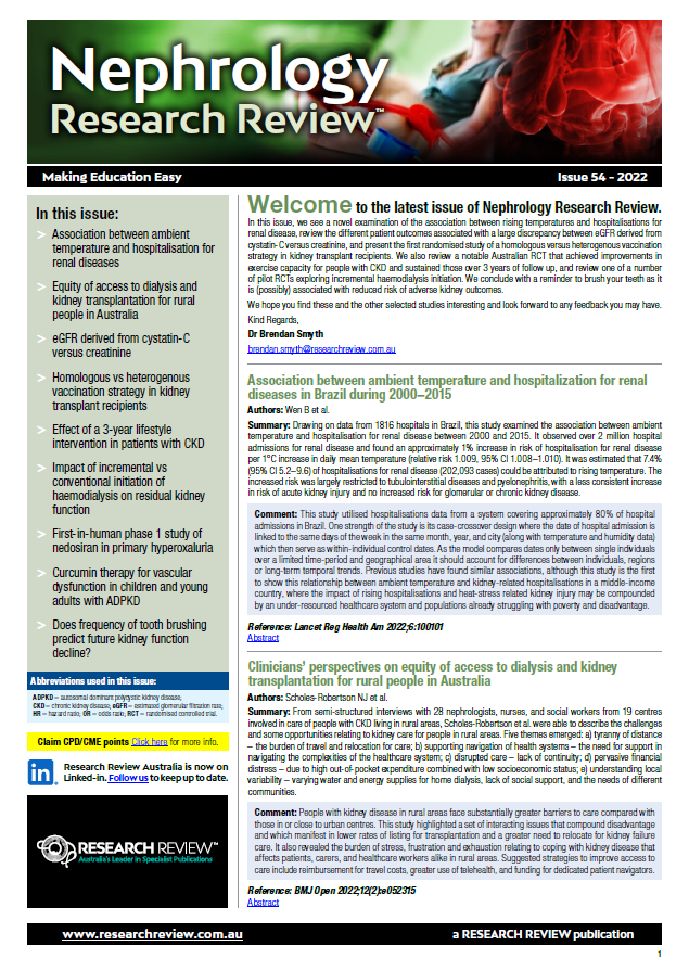This Review features key medical articles from global nephrology journals with commentary from Professor Vlado Perkovic and Dr Brendan Smyth. The Review covers topics such asperitoneal dialysis, acute renal failure, diabetic nephrology, renal osteodystrophy, autoimmune kidney disease, transplant rejection, immunosuppression and monoclonal antibodies.