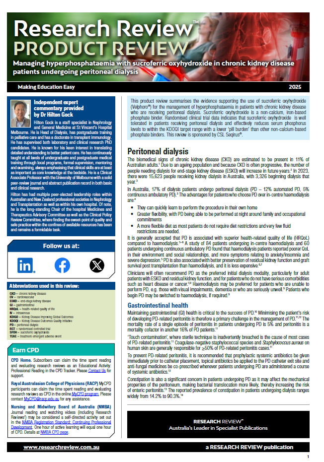 As part of our series focussing on medicines available in Australia, we have added a product review of the use of sucroferric oxyhydroxide in the management of hyperphosphataemia in chronic kidney disease patients undergoing peritoneal dialysis.