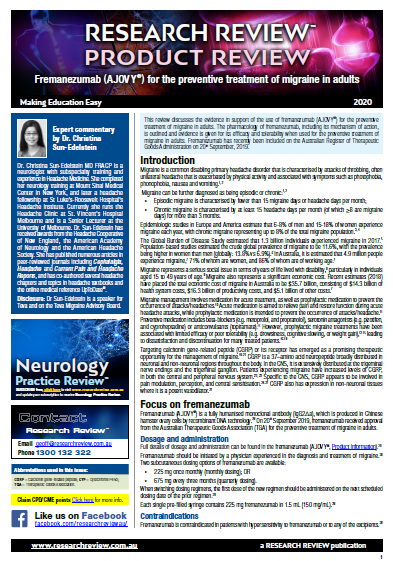 This review discusses the evidence in support of the use of fremanezumab, its pharmacology including its mechanism of action, and efficacy and tolerability demonstrated in pivotal clinical trials. It also provides commentary and recommendations from Dr. Christina Sun-Edelstein a Neurologist with subspecialty training in Headache Medicine who runs the Headache Clinic at St. Vincent’s Hospital Melbourne and is a Senior Lecturer at the University of Melbourne.