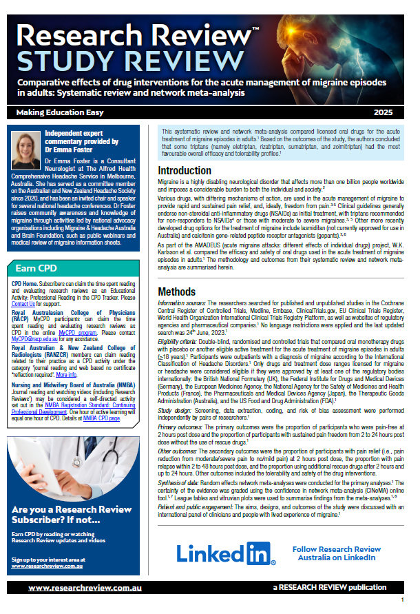 Independent commentary for the review has been provided by Dr Emma Foster, a Consultant Neurologist at The Alfred Health Comprehensive Headache Service in Melbourne, Australia.