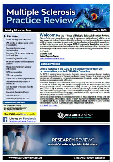 This Review features key medical articles from global neurology journals with commentary from Clinical A/Prof Todd Hardy. The Review covers topics such as multiple sclerosis, inflammatory disease, treatment guidelines, relapses, stem cell therapy, physical therapy, pain management and disease-modifying drugs.