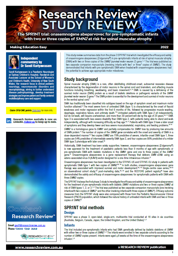As part of our ongoing aim to bring you reports of significant or innovative developments, we have added a review of the SPR1NT trial which investigated the efficacy and safety of onasemnogene abeparvovec in pre-symptomatic infants at risk of spinal muscular atrophy.