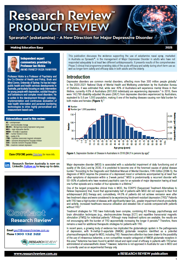 This review discusses pharmacological properties, mechanism of action, drug interactions and major studies featuring Esketamine. It also provides commentary and recommendations from Professor Ian Hickie, Professor of Psychiatry and the Co-Director of Health and Policy, Brain and Mind Centre, University of Sydney.