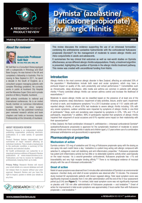 It summarises the key clinical trial outcomes as well as real-world studies on Dymista effectiveness, across different allergic rhinitis subpopulations. Finally, a treatment algorithm is presented, highlighting the position of Dymista in the allergic rhinitis treatment pathway. This review was created with unconditional funding from Viatris.