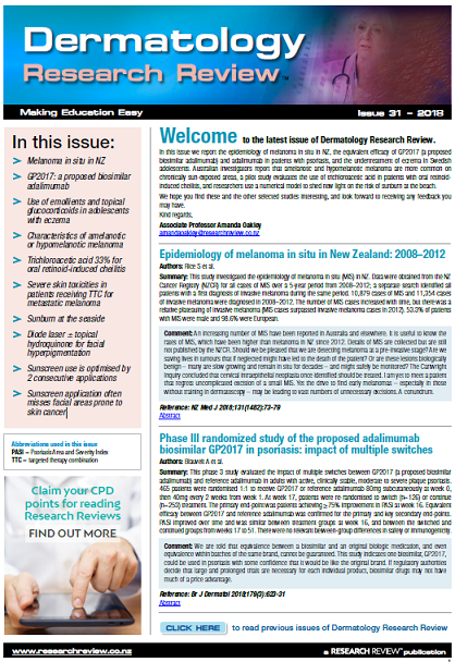 The Australasian College of Dermatologists (ACD) has approved all Dermatology Research Reviews for accreditation as a Category 1 Education Activities – Professional Reading and Study. Activity should be logged in hours. For further information including the ACD CPD Handbook and other resources, please click here.