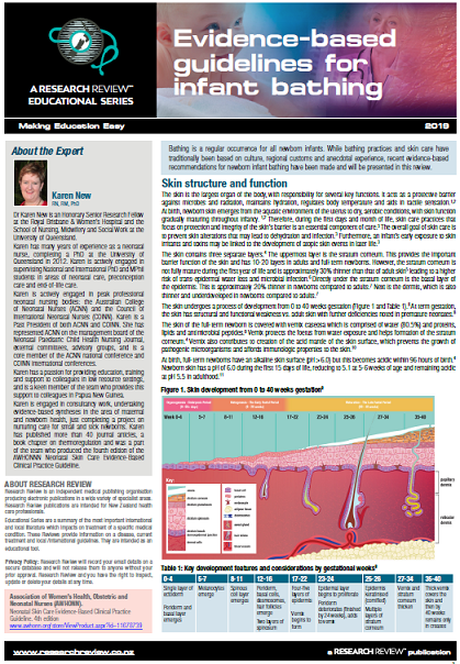 Bathing is a regular occurrence for all newborn infants. While bathing practices and skin care have traditionally been based on culture, regional customs and anecdotal experience, recent evidence-based recommendations for newborn infant bathing have been made and will be presented in this review.