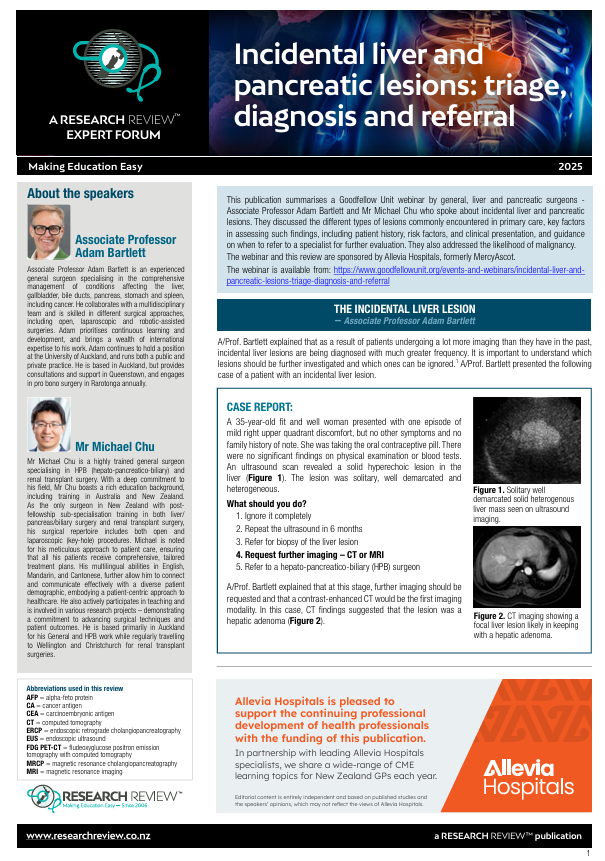This publication summarises a Goodfellow Unit webinar by general, liver and pancreatic surgeons - Associate Professor Adam Bartlett and Mr Michael Chu who spoke about incidental liver and pancreatic lesions. They discussed the different types of lesions commonly encountered in primary care, key factors in assessing such findings, including patient history, risk factors, and clinical presentation, and guidance on when to refer to a specialist for further evaluation. They also addressed the likelihood of malignancy. The webinar and this review are sponsored by Allevia Hospitals, formerly MercyAscot. The webinar is available from: https://www.goodfellowunit.org/events-and-webinars/incidental-liver-and pancreatic-lesions-triage-diagnosis-and-referral