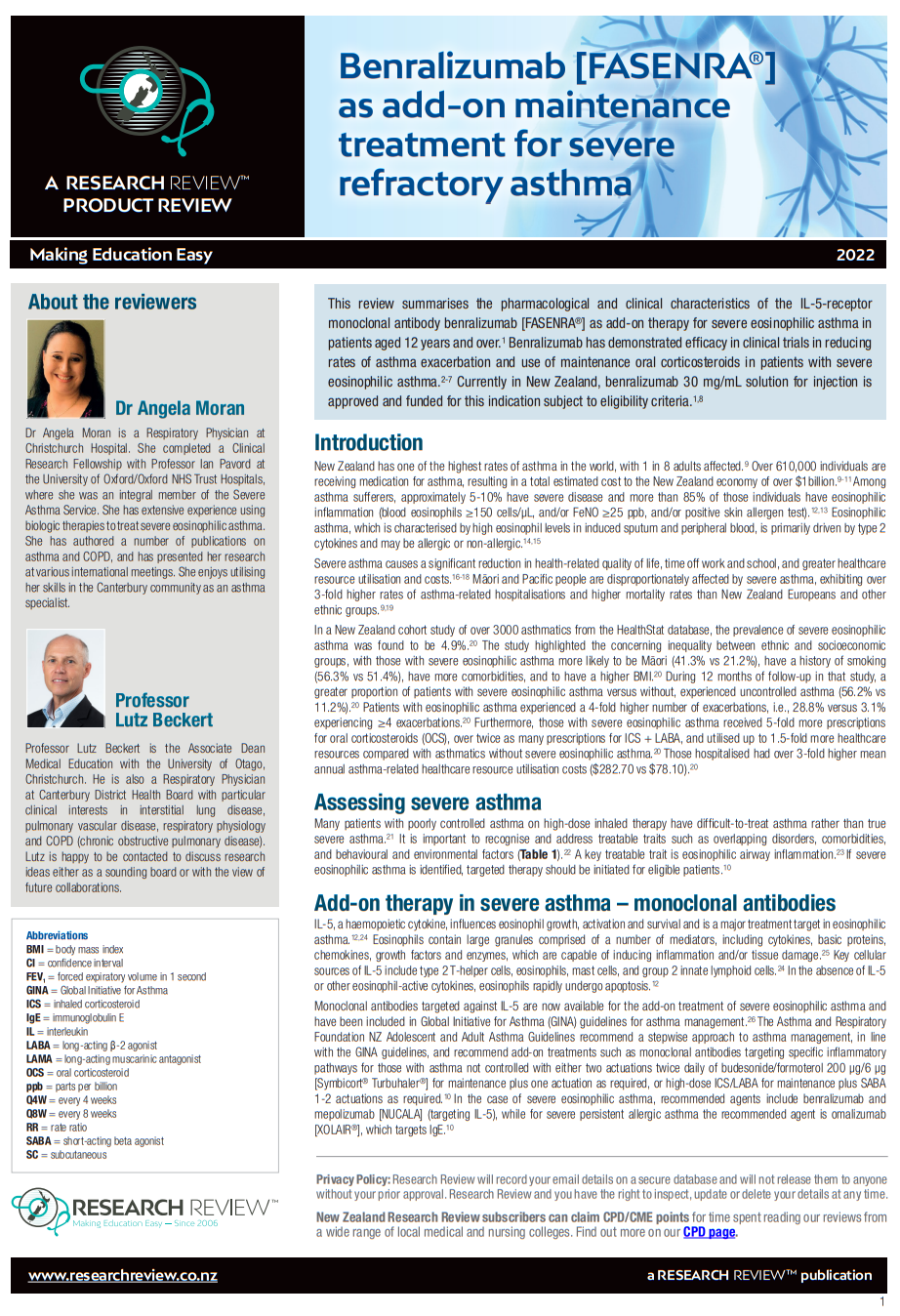 This review summarises the pharmacological and clinical characteristics of the IL-5-receptor monoclonal antibody benralizumab [FASENRA®] as add-on therapy for severe eosinophilic asthma in patients aged 12 years and over. Benralizumab has demonstrated efficacy in clinical trials in reducing rates of asthma exacerbation and use of maintenance oral corticosteroids in patients with severe eosinophilic asthma. Currently in New Zealand, benralizumab 30 mg/mL solution for injection is approved and funded for this indication subject to eligibility criteria.