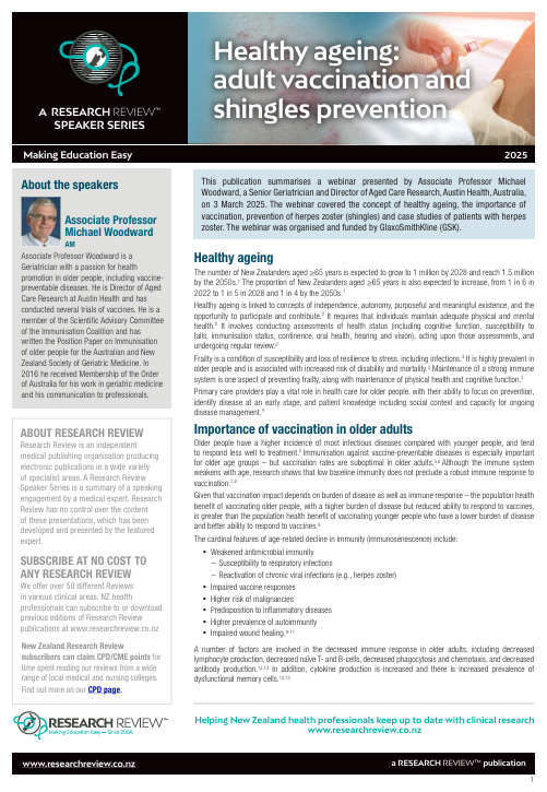 This publication summarises a webinar presented by Associate Professor Michael Woodward, a Senior Geriatrician and Director of Aged Care Research, Austin Health, Australia, on 3 March 2025. The webinar covered the concept of healthy ageing, the importance of vaccination, prevention of herpes zoster (shingles) and case studies of patients with herpes zoster. The webinar was organised and funded by GlaxoSmithKline (GSK).