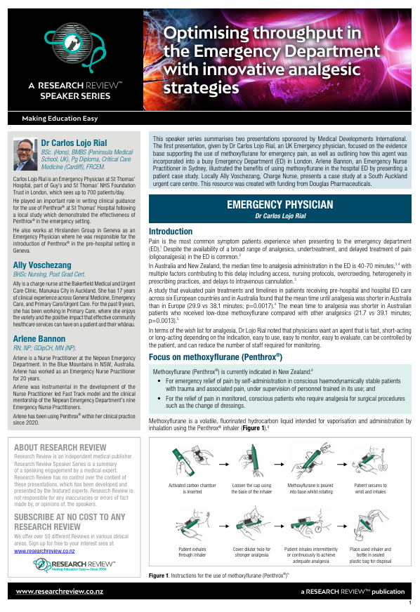 This speaker series summarises two presentations sponsored by Medical Developments International. The first presentation, given by Dr Carlos Lojo Rial, an UK Emergency physician, focused on the evidence base supporting the use of methoxyflurane for emergency pain, as well as outlining how this agent was incorporated into a busy Emergency Department (ED) in London. Arlene Bannon, an Emergency Nurse Practitioner in Sydney, illustrated the benefits of using methoxyflurane in the hospital ED by presenting a patient case study. Locally Ally Voschezang, Charge Nurse, presents a case study at a South Auckland urgent care centre. This resource was created with funding from Douglas Pharmaceuticals.