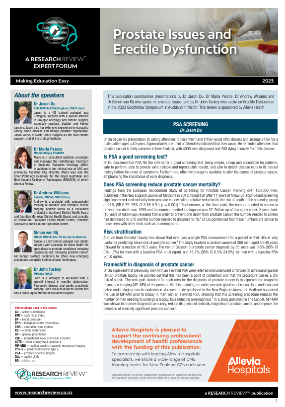 This publication summarises presentations by Dr Jason Du, Dr Maria Pearce, Dr Andrew Williams and Dr Simon van Rij who spoke on prostate issues, and by Dr John Tuckey who spoke on Erectile Dysfunction at the 2023 Goodfellow Symposium in Auckland in March.