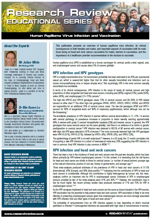 This publication presents an overview of human papilloma virus infection, its clinical consequences in both females and males, and important aspects of vaccination with its main focus being on head and neck cancer, vaccination for males, barriers to vaccination, and the importance of a healthcare provider recommendation in the decision to vaccinate.