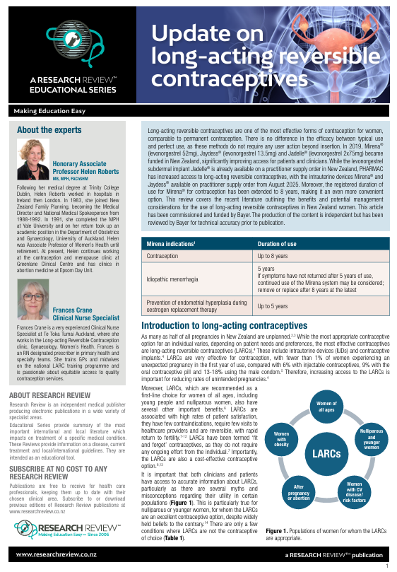 Long-acting reversible contraceptives are one of the most effective forms of contraception for women, comparable to permanent contraception. There is no difference in the efficacy between typical use and perfect use, as these methods do not require any user action beyond insertion. In 2019, Mirena® (levonorgestrel 52mg), Jaydess® (levonorgestrel 13.5mg) and Jadelle® (levonorgestrel 2x75mg) became funded in New Zealand, significantly improving access for patients and clinicians. While the levonorgestrel subdermal implant Jadelle® is already available on a practitioner supply order in New Zealand, PHARMAC has increased access to long-acting reversible contraceptives, with the intrauterine devices Mirena® and Jaydess® available on practitioner supply order from August 2025. Moreover, the registered duration of use for Mirena® for contraception has been extended to 8 years, making it an even more convenient option. This review covers the recent literature outlining the benefits and potential management considerations for the use of long-acting reversible contraceptives in New Zealand women.