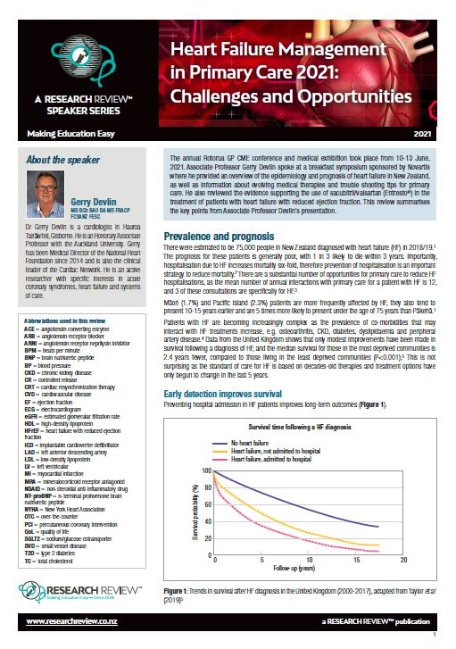 The annual Rotorua GP CME conference and medical exhibition took place from 10-13 June, 2021. Associate Professor Gerry Devlin spoke at a breakfast symposium sponsored by Novartis where he provided an overview of the epidemiology and prognosis of heart failure in New Zealand, as well as information about evolving medical therapies and trouble shooting tips for primary care. He also reviewed the evidence supporting the use of sacubitril/valsartan (Entresto®) in the treatment of patients with heart failure with reduced ejection fraction. This review summarises the key points from Associate Professor Devlin’s presentation.