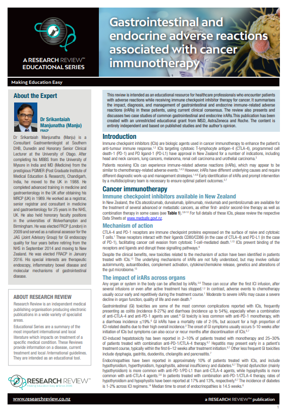 This review is intended as an educational resource for healthcare professionals who encounter patients with adverse reactions while receiving immune checkpoint inhibitor therapy for cancer. It summarises the impact, diagnosis, and management of gastrointestinal and endocrine immune-related adverse reactions (irARs) in these patients, using current clinical consensus. The review also presents and discusses two case studies of common gastrointestinal and endocrine irARs.This publication has been created with an unrestricted educational grant from MSD, AstraZeneca and Roche. The content is entirely independent and based on published studies and the author’s opinion.