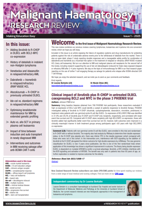 Multiple Myeloma Research Review is currently published in conjunction with Lymphoma and Leukaemia Research Review. Expert commentary for Lymphoma and Leukaemia Research Review is provided by Dr Leanne Berkahn.