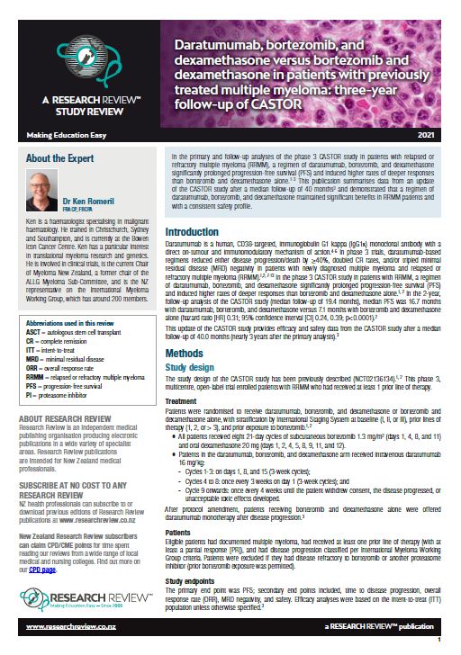 In the primary and follow-up analyses of the phase 3 CASTOR study in patients with relapsed or refractory multiple myeloma (RRMM), a regimen of daratumumab, bortezomib, and dexamethasone significantly prolonged progression-free survival (PFS) and induced higher rates of deeper responses than bortezomib and dexamethasone alone.1-3 This publication summarises data from an update of the CASTOR study after a median follow-up of 40 months3 and demonstrated that a regimen of daratumumab, bortezomib, and dexamethasone maintained significant benefits in RRMM patients and with a consistent safety profile.