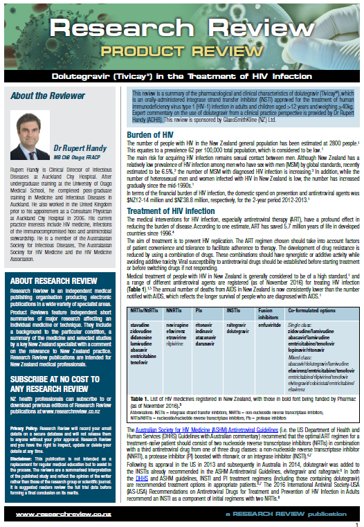 This review is a summary of the pharmacological and clinical characteristics of dolutegravir (Tivicay®), which is an orally-administered integrase strand transfer inhibitor (INSTI) approved for the treatment of human immunodeficiency virus type 1 (HIV-1) infection in adults and children aged >12 years and weighing ≥40kg.Expert commentary on the use of dolutegravir from a clinical practice perspective is provided by Dr Rupert Handy (ADHB).