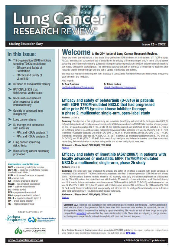 Drs Paul Dawkins and Aileen Ludlow. This review will bring you some of the most significant published research on lung cancer from around the world. Each issue contains an independent selection of papers chosen by medical specialists discussing what is relevant and how it can potentially influence current practice.