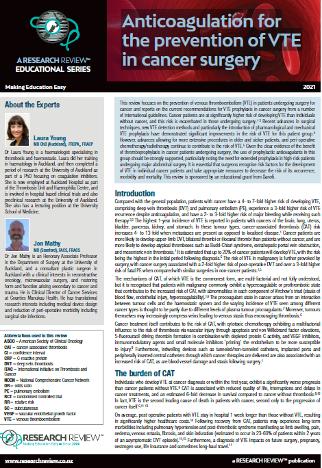 This review focuses on the prevention of venous thromboembolism (VTE) in patients undergoing surgery for cancer and reports on the current recommendations for VTE prophylaxis in cancer surgery from a number of international guidelines. Cancer patients are at significantly higher risk of developing VTE than individuals without cancer, and this risk is exacerbated in those undergoing surgery. Recent advances in surgical techniques, new VTE detection methods and particularly the introduction of pharmacological and mechanical VTE prophylaxis have demonstrated significant improvements in the risk of VTE for this patient group. This review is sponsored by an educational grant from Sanofi.
