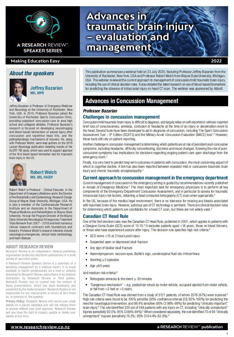 This publication summarises a webinar held on 23 July 2020, featuring Professor Jeffrey Bazarian from the University of Rochester, New York, USA and Professor Robert Welch from Wayne State University, Michigan, USA. The webinar reviewed the current approach to management of concussion/mild traumatic brain injury, including the use of clinical decision rules. It also detailed the latest research on use of blood-based biomarkers for predicting the absence of intracranial injury on head CT scan. The webinar was sponsored by Abbott.